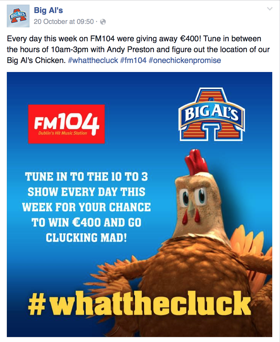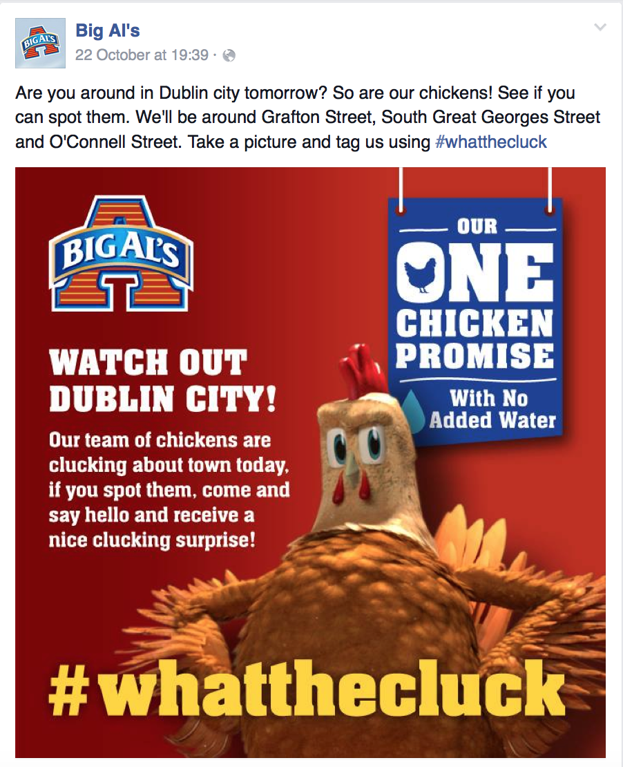 The first TV campaign for Kepak Foods in many years for their Big Al's brand, the creative idea highlighted the tasty difference between Big Al's and the rest of the brood. Brought to life using humorous animation, we amplified the idea across the brand's social media channels as well as radio promotions, competitions and on-street activations. We also promoted it on our Facebook page using the cheeky hashtag #whatthecluck.